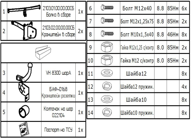Комплектация фаркопа 2103-A: