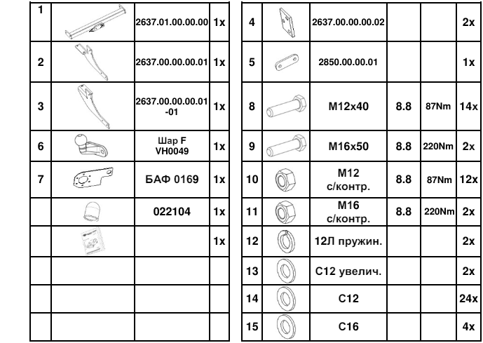 Грузоподъемность фаркопа 2637-F на Ивеко Дэйли 2014-, рассчитывается теоретически и подтверждается динамическими испытаниями. Максимальная масса буксируемого прицепа 2500 кг при статической вертикальной нагрузке на шар 120 (макс.), кг. Фаркоп с типом шара: Fна Iveco Daily 2014-, удобен в эксплуатации, благодаря своей съемной части, при этом основная рама с кронштейном фаркопа скрыты за бампером и за габариты автомобиля не выступаютКомплектация фаркопа 2637-F: