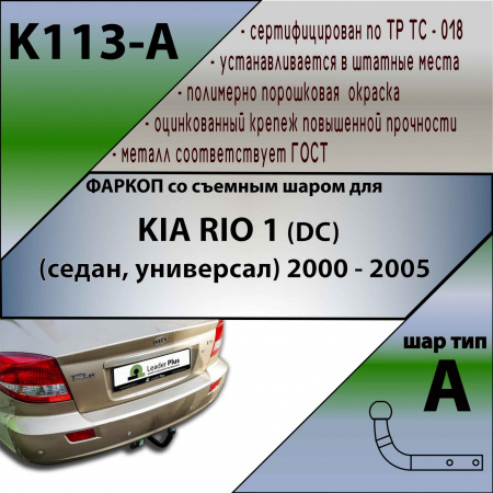Фаркоп K113-A от российского производителя Лидер-Плюс для автомобиля KIA RIO первого поколения (DC) в куове седан и универсал 2000-2005 года выпуска. Тягово-сцепное устройство с типом шара «А» крепится на двух болтах и контр. гайках повышенной прочности 8.8. ТСУ марки «Leader» имеет все сертификаты качества, в паспорте изделия указана его модель и применимость на данном автомобиле. ТСУ не предназначен для буксировки автомобилей на гибкой сцепке. В комплекте с фаркопом идут необходимые болты, крепёжные элементы и с завода установлен подрозетник. Электрика и колпачок в комплект не входит и докупается отдельно в магазине ФаркопРос в Новосибирске.